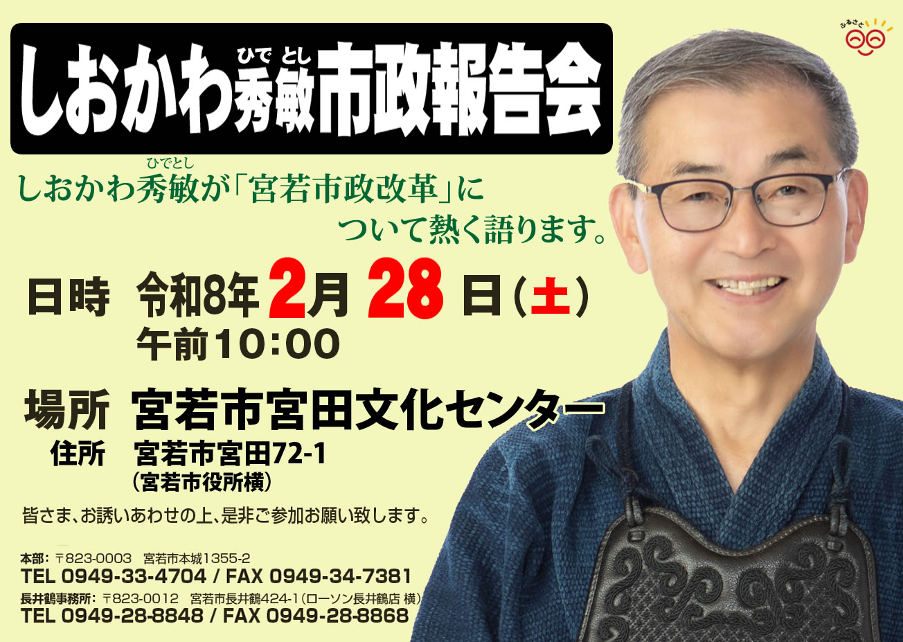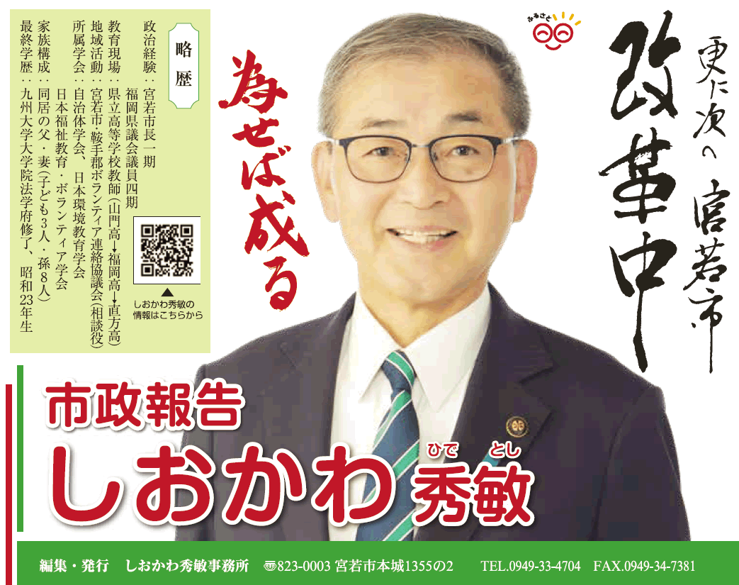 また、皆様のご期待に沿うよう『市民目線』『市民主体』『人権尊重』の施政方針のもと、誠心誠意取り組んで参りました。尚、宮若市は現在、改革進行中です。必ず元気でやさしいまちになります。